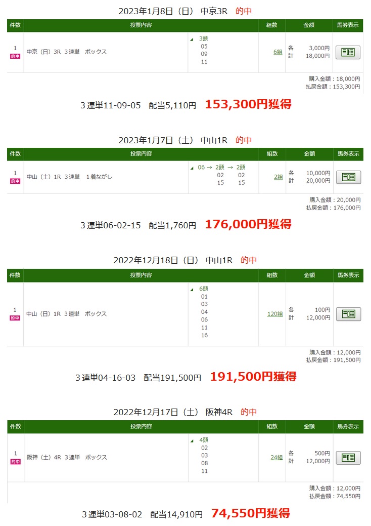 的中の出る情報を入手して買い目を提供するからこそ、安定した的中配当。買い目は過去15年間で集計、実績、結果がしっかりと出ており、プラスの収益を出せる情報を提供。正確な買い目で高配当的中を実感してください。