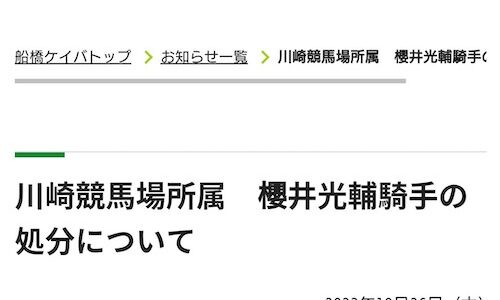 川崎の桜井光輔騎手が実効30日間の騎乗停止処分、競馬開催中に携帯電話持ち込み