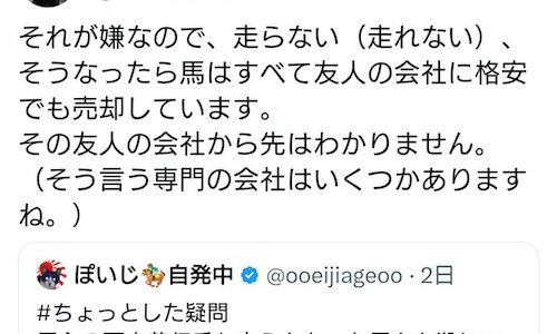 引用元:「馬主の西山茂行氏も走らなかった馬を殺しているんだろうか?」 ←この質問に西山オーナー本人が回答【https://awabi.2ch.sc/test/read.cgi/keiba/1706710154】